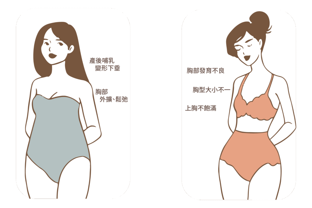 對​於胸部​發育​不足、​產後​哺乳導致鬆弛​下垂、​或​左右