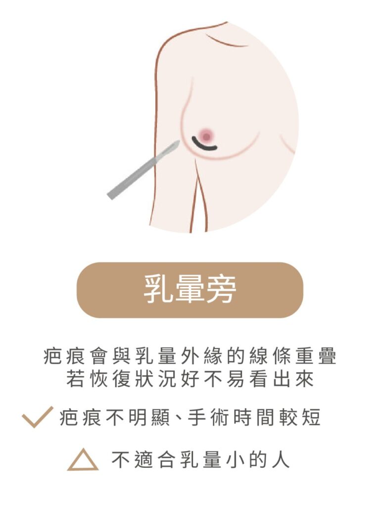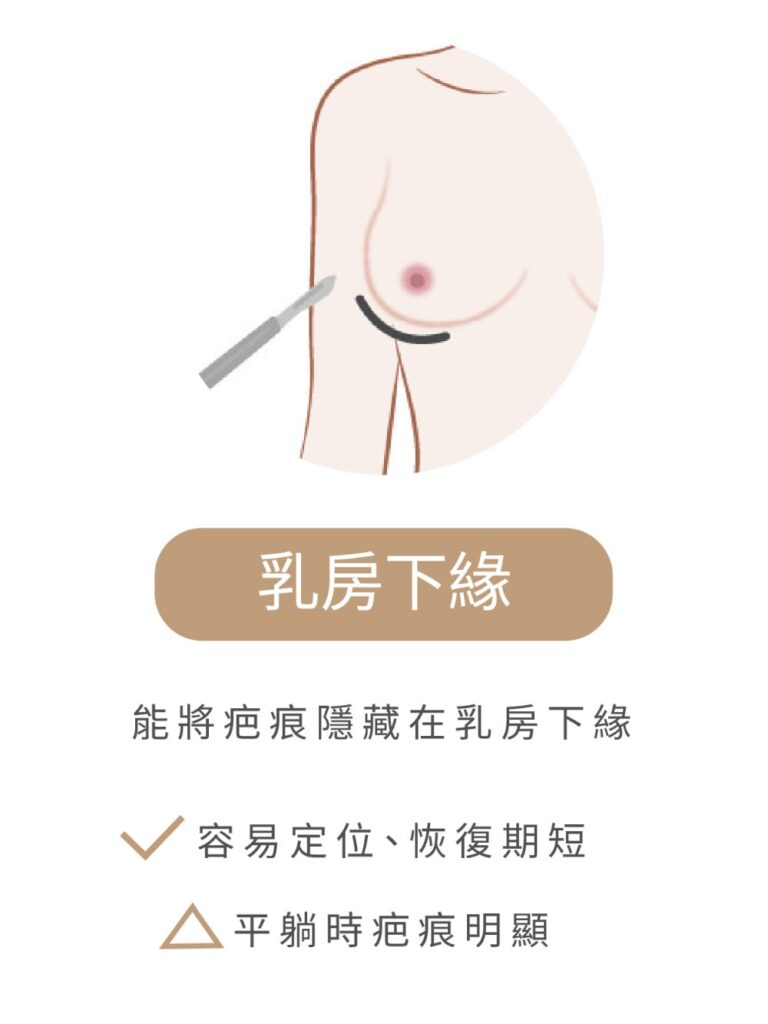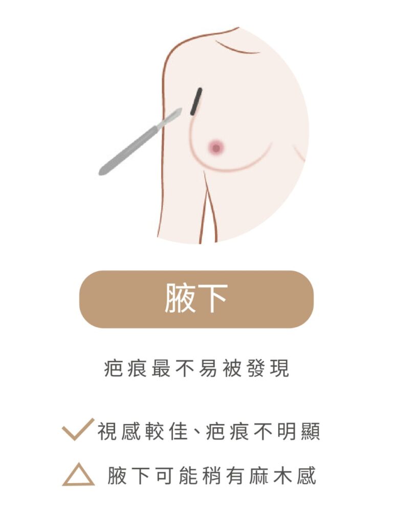 手術​可​選擇從​腋下、​乳暈​或​胸下緣​植入,​依個​人​條件​與假體​規格​由​醫師​評估​決定。​